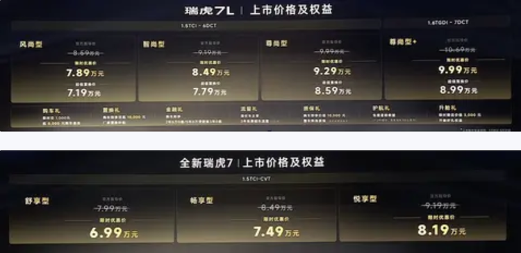 4月8日, 奇瑞瑞虎7(参数|询价)L已经新款瑞虎7正式上市,其中瑞虎7车型推出3款配置车型,限时优惠价区间6.99万元-8.19万元;瑞虎7L则推出4款配置车型,分别搭载不同动力单元,超级置换价区间7.19万元-8.99万元。