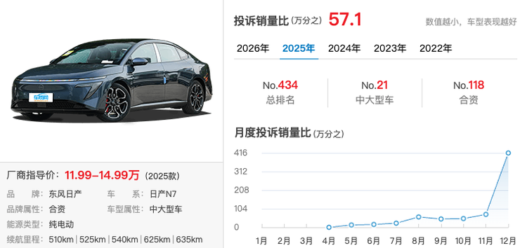 根据用户投诉需要认证并可获车企受理的平台——车质网的数据,日产N7在上市后的第九个月出现投诉销量比明显上升的情况,全年投诉销量比为万分之57.1,在同类车型中处于中游水平。不过需要留意的是,关于日产N7质量问题的用户投诉主要集中在车身附件及电器方面,换言之主要都是不影响行驶安全的小毛病。