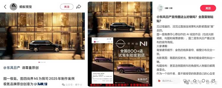 不过,这种带有攻击性的刷存在感手段也有风险,例如今年4月初东风日产的一张日产NX8宣传海报,就被某设计公司质疑有抄袭的嫌疑。对于这样一发“回旋镖”,王骞和东风日产截至发稿都还没有回应,但相关海报已经下架。