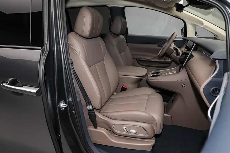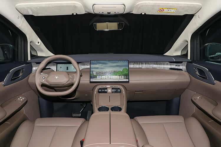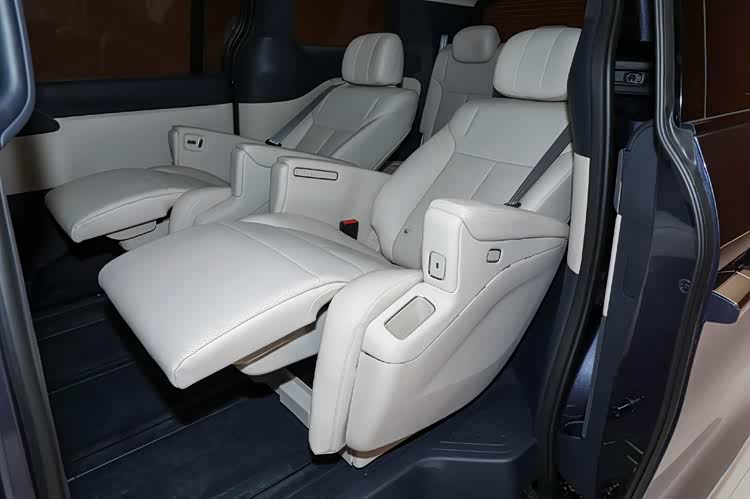 内饰以“移动会客厅”为核心,大面积软性材质包裹,质感细腻。第二排为双零重力独立座椅,支持124°角度调节、16点按摩、腿托伸展、通风及石墨烯加热功能。二排还配备21英寸折叠吸顶屏、小桌板及11L车载冰箱,冰箱彩电大沙发一步配齐。