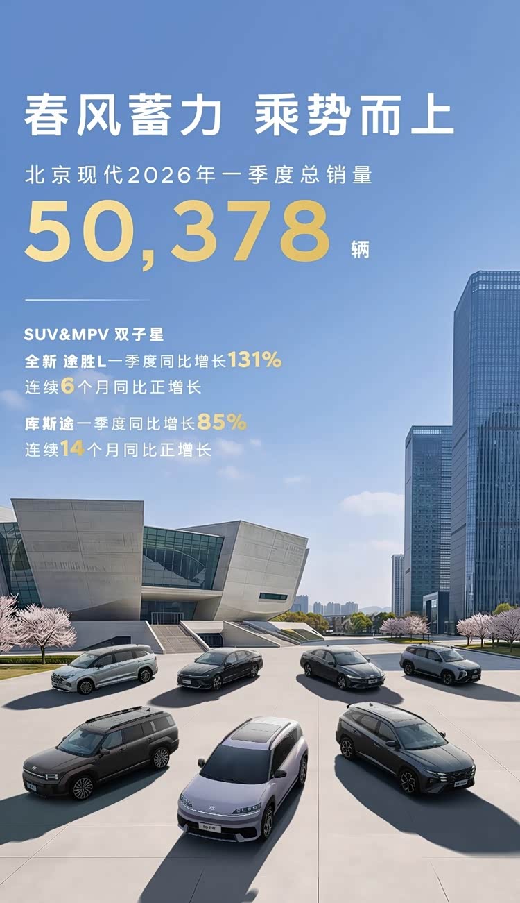 就在4月1日,北京现代正式公布2026年一季度销量成绩单,交出一份逆势上扬的亮眼答卷,尽显品牌强劲发展势能。数据显示,北京现代一季度整体市场表现稳健,销量突破5万辆,其中 全新途胜(参数|询价)L同比增幅高达131%,实现连续六个月销量正增长;库斯途同比上涨85%,更是创下连续14个月同比增长的佳绩,稳居20万级合资MPV热门席位。回望2025全年,北京现代累计销量突破21万辆,销量曲线持续向上攀升,彰显市场与消费者对北京现代产品力、性价比的高度认可。
