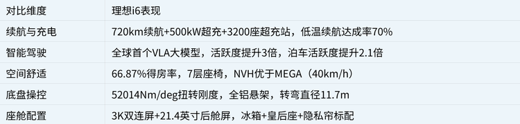 NVH表现上,据理想官方测试,理想i6在40km/h状态下车内噪音为50.3分贝,甚至优于理想MEGA的50.9分贝。 全车经过超150处声学材料处理,声学材料覆盖率95%,前风挡、天幕、前后车门全系标配声学夹层玻璃,并配备MEGA Home同款RNC主动降噪。