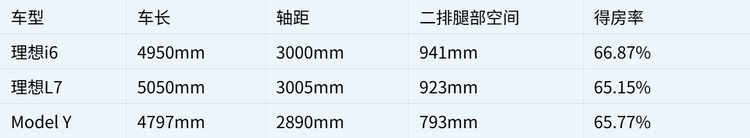 理想i6在4950mm车长、3000mm轴距的尺寸下,实现了66.87%的得房率,超越理想L7(65.15%)和Model Y(65.77%)。 具体数据如下: