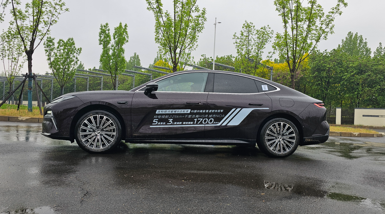 来到侧面,溜背造型颇为明显,车头和车尾均有向下延伸的感觉。车尾依旧是我们非常熟悉的贯穿式尾灯造型,下包围则采用隐藏式排气管布局。