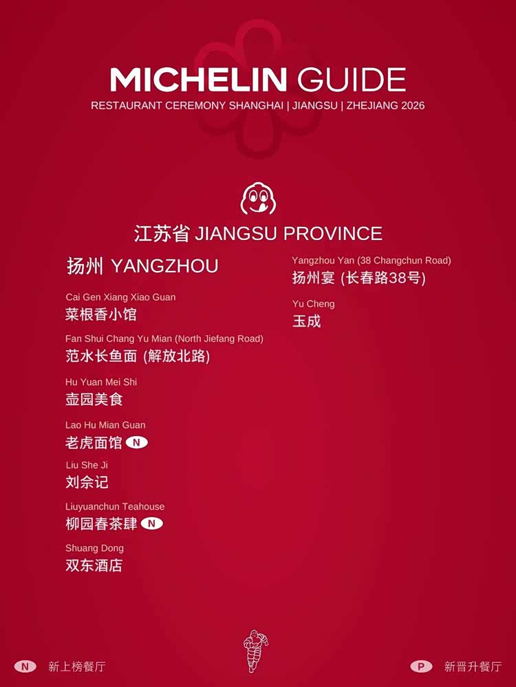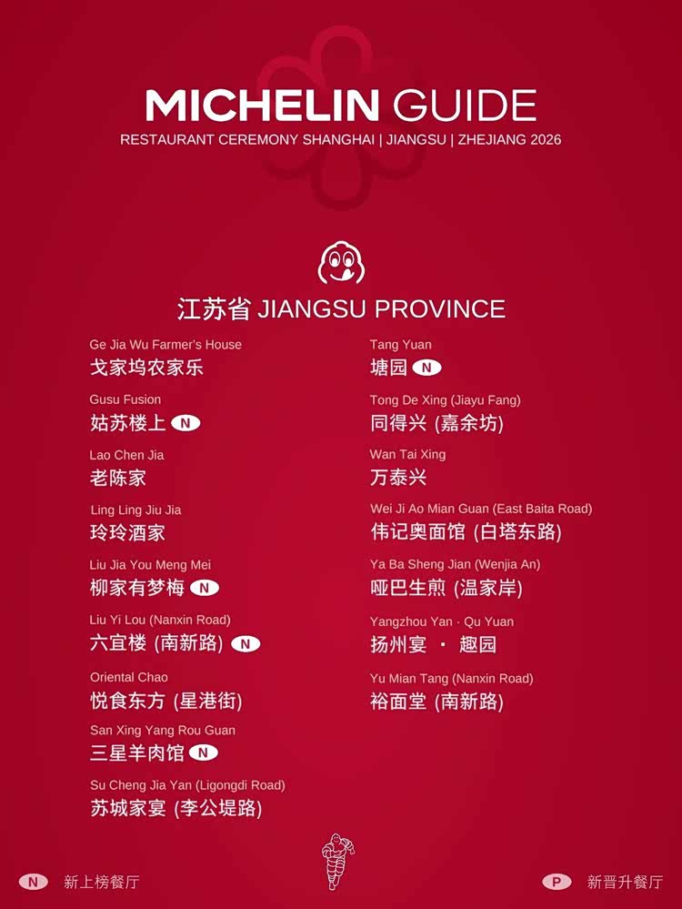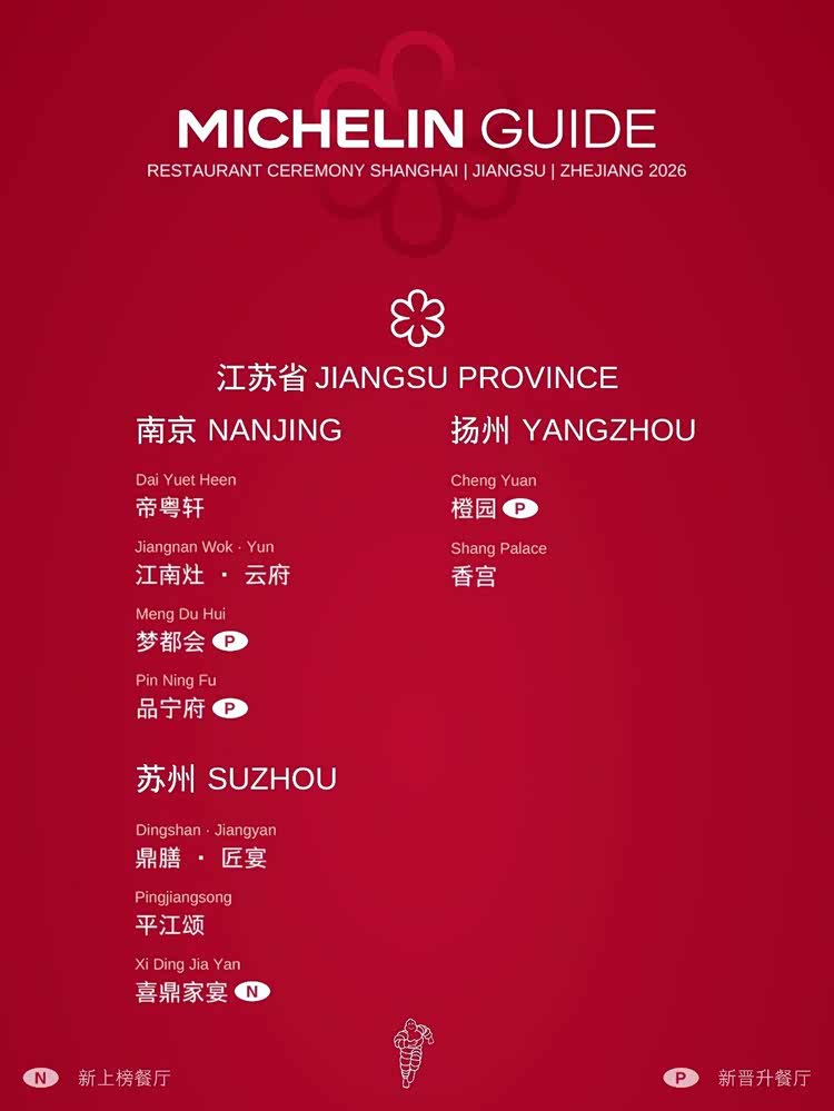 9家米其林一星:南京4家(其中2家新晋餐厅),苏州3家(其中1家新上榜),扬州2家(其中1家新晋餐厅)