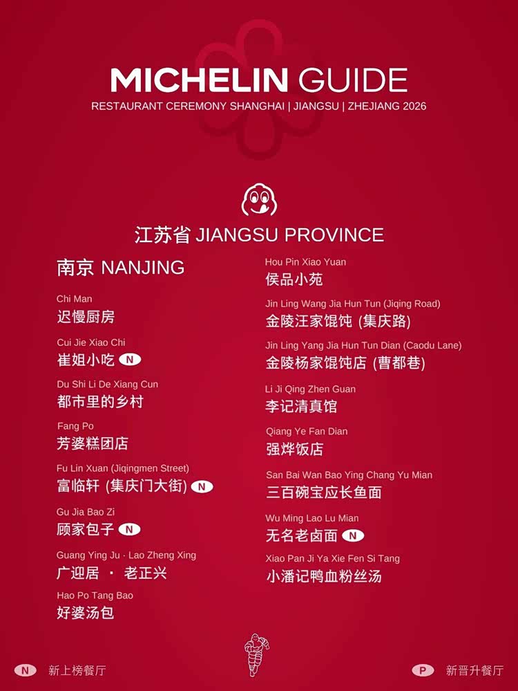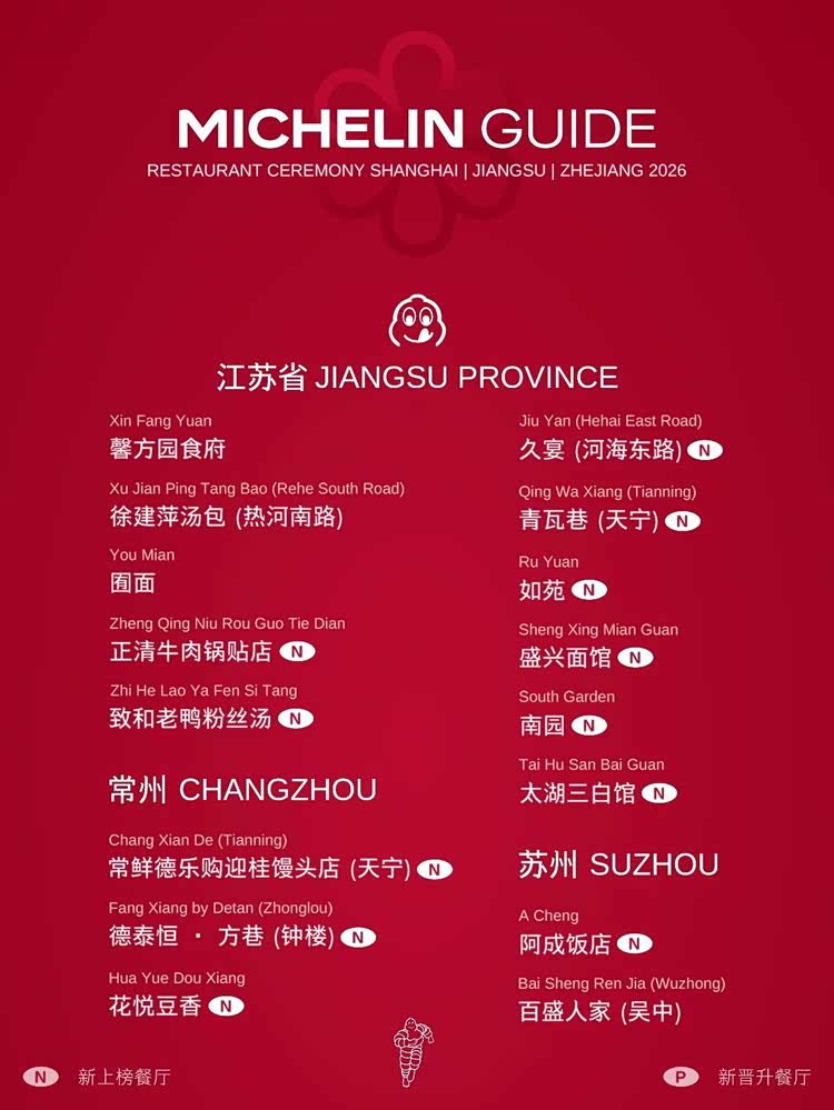 45家米其林指南入选餐厅:南京16家(其中5家新上榜),常州7家(全部新上榜),苏州17家(其中3家新上榜),扬州5家(其中1家新上榜)