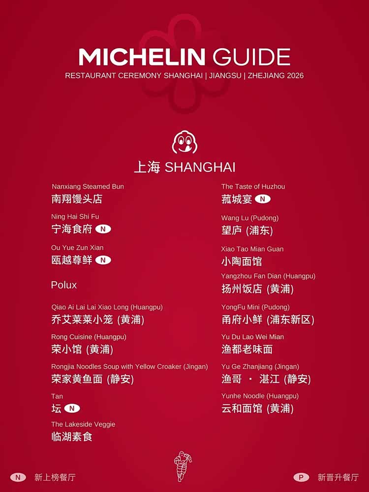 星级之外,全球美食爱好者所熟知的、专注于推荐美味实惠的必比登推介榜单亦有更新。新增8家餐厅,包括本地人熟知的本帮菜馆157食坊和面馆和膳面家;江浙风味面馆阿勇面馆(东书房路)和菰城宴;传统潮州菜馆瑰禧、地道宁波菜餐厅宁海食府、浙江菜风格的瓯越尊鲜,以及川菜餐厅坛。本次必比登推介榜单共收录35家餐厅,囊括17种烹调风格,尽显上海餐饮的蓬勃活力与多元表现。