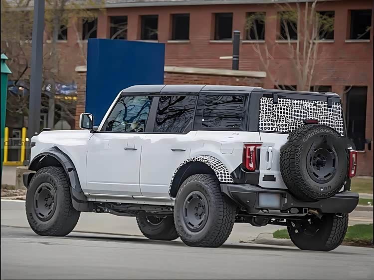 从谍照看,新款Bronco还是那个经典的方盒子造型,这个没动是对的,毕竟这款车的灵魂就在这儿。不过细节上的调整挺有意思,前脸格栅换成了新样式,那个大大的"BRONCO"字母标识明显收敛了不少,不再那么抢眼,我个人觉得这个改动反而更耐看。最吸引我的是它身上那套全新的黑化运动套件,后视镜外壳、门把手都改成了和车身同色的设计,前后保险杠的造型也更复杂更有层次感,乍一看还真有点改装车的味道。对于经常跑野外的越野车来说,这种深色塑料件其实挺实用,刮花了也不心疼,比那些花里胡哨的镀铬装饰实在多了。