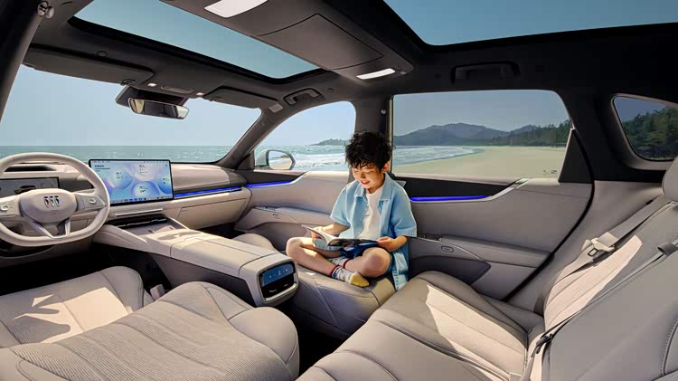 坐进车里,第一感觉是别克这次在用料上确实舍得下本。座椅和门板用了带波纹纹理的软包,官方叫"水生美学",摸上去手感不错,据说是母婴级亲肤材质。四座都标配加热通风,前排还有多点按摩,副驾直接上了零重力座椅,坐垫、靠背、腿托都能调,躺下去跟家里沙发差不多。后排靠背能无级调节,还配了15.6寸吸顶屏、20个扬声器的杜比全景声,冷暖箱、小桌板这些也都安排上了。带娃出门或者长途自驾,这些配置是真的实用。