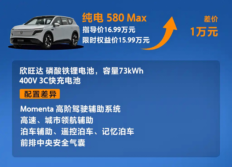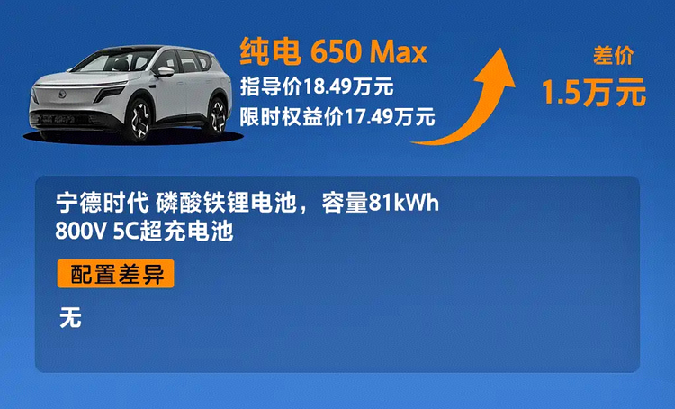 纯电580 Max与650 Max之间存在1.5万元差价,主要差别在于电池容量与续航表现。650 Max采用800V平台与5C充电能力,在补能效率上更具优势,但对于日常通勤半径有限的用户而言,580km续航已能覆盖大多数使用场景。因此,中配580 Max在价格与功能之间形成平衡,而高配更适合对续航与补能效率有明确需求的用户。