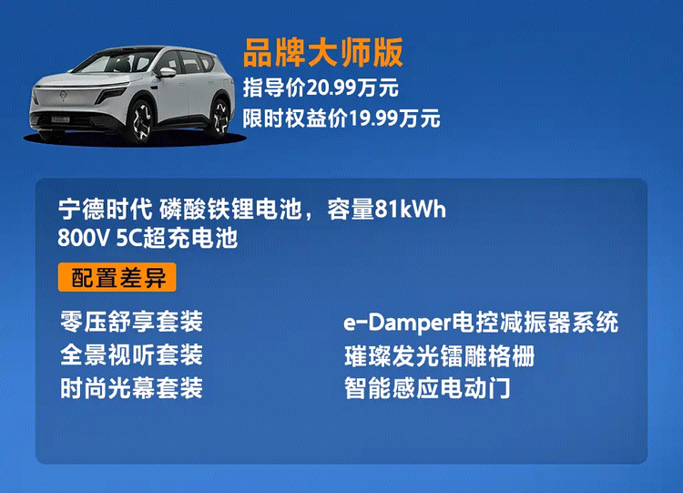 品牌大师版基于纯电650 Max打造,整合全部选装配置,并增加电控减振器与电动门系统。与650 Max相比,价格增加约2.5万元,而选装包本身价值约2.4万元,再叠加额外硬件配置,从价格结构来看具备一定合理性。这一版本更适合预算充足且不希望反复选择配置的用户,但对多数家庭用户而言,并非唯一选择路径。