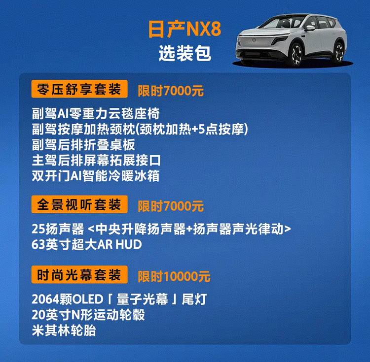 NX8提供零压舒享、全景视听与时尚光幕三类选装包,覆盖座椅、影音与灯光系统。这种配置策略将部分高频使用配置从固定版本中拆分,使用户可以根据需求进行组合。但从实际选购角度来看,也增加了决策成本,需要用户明确自身使用场景。