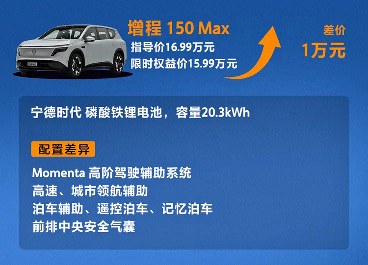 入门版增程150 Pro已具备完整舒适配置,但电池容量为21.1kWh,纯电续航150km,适合短途使用。增程150 Max在价格增加1万元基础上,引入Momenta辅助驾驶系统,包含激光雷达与NOA功能,同时增加中央气囊。这一版本在主动安全与驾驶辅助层面更完整,从使用频率来看,提升明显。增程310 Max进一步将电池升级至43.2kWh,纯电续航提升至310km,但配置层面与150 Max一致,因此选择逻辑主要取决于通勤距离与充电便利性。