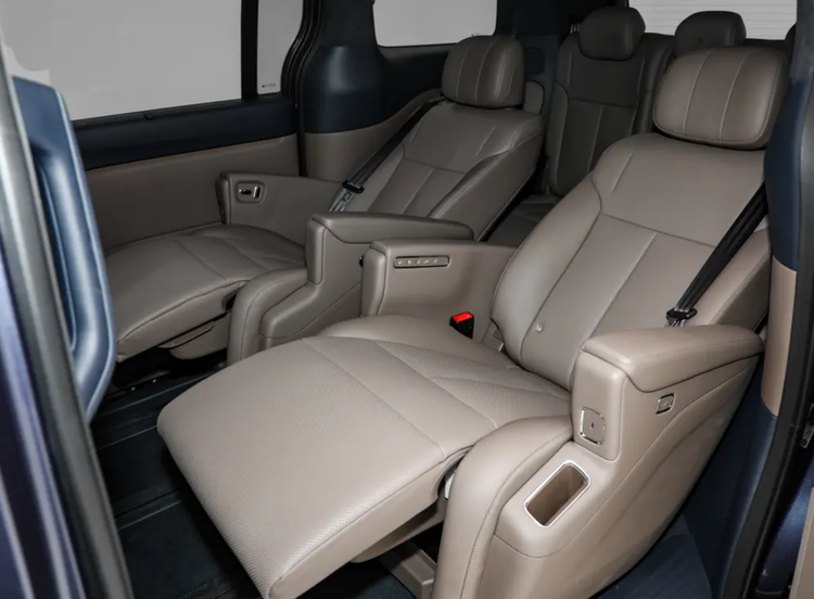 而且这台商务MPV的用料都很足,棕色纳帕真皮也能够带来商务属性,第二排座椅的腿托、灵活性很高,并且按键都设置在扶手位置,使用起来也是简单方便,相比那些触屏设计,物理按键的灵敏度更高。可以看到扶手处还有一个手机槽,通过这些细节设计也能改善乘坐的便利性。而且它的座椅也做到最大角度调节,甚至可以躺着下的一个状态,那它中间过道也有170mm宽,意味着进入第三排更加轻松,包括第三排是三座位布局,就算三位大人横向坐着也不会拥挤。也是实际上解决了第三排乘客的坐姿,因为配有智能调节悬挂,因此第三排乘客也不会晕车,同时也保证了刹车时不会点头,遇到烂路也不会颠簸的一个乘坐姿态。