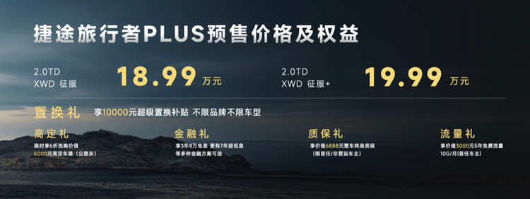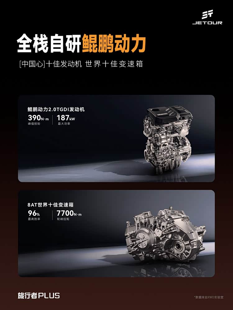 先看燃油版 捷途旅行者(参数|询价)PLUS,两款车型分别是2.0TD XWD征服(18.99万)和2.0TD XWD征服+(19.99万),核心配置完全一致,差异仅在细节升级。动力上全系标配鲲鹏2.0TGDI发动机+8AT变速箱,峰值功率187kW、扭矩390N·m。四驱方面,搭载XWD全自动智能四驱,配合智能限滑差速锁,脱困不用停车切换模式,同时配备行业唯一的“7+X”一键智能模式,7种预设地形(经济、标准、运动、雪地、泥地、沙地、岩石)可自由切换,一键“X”模式能自动识别路况匹配最优方案,新手无需复杂操作就能上手。