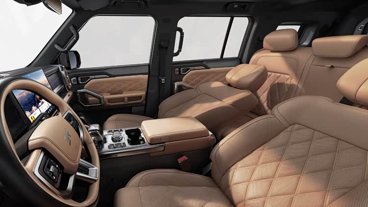 智能配置上,TOUR OS 3.0座舱、科大讯飞星火AI、15.6英寸2.5K屏+高通8155芯片,全系标配540°全景影像,新手也能轻松应对复杂路况。内饰是硬派越野少见的豪华感,水晶档把、64英寸全景天窗、10层舒云大沙发,主驾还有8点按摩,长途穿越不遭罪。安全上,潜艇级车身扭转刚度31000N·m/deg,80%高强度钢打造笼式车身,车顶能承载150Kg,越野时多一份保障。通过性也达标,接近角28°、离去角23°,最小离地间隙220mm,700mm涉水深度,常规越野场景完全能hold住。