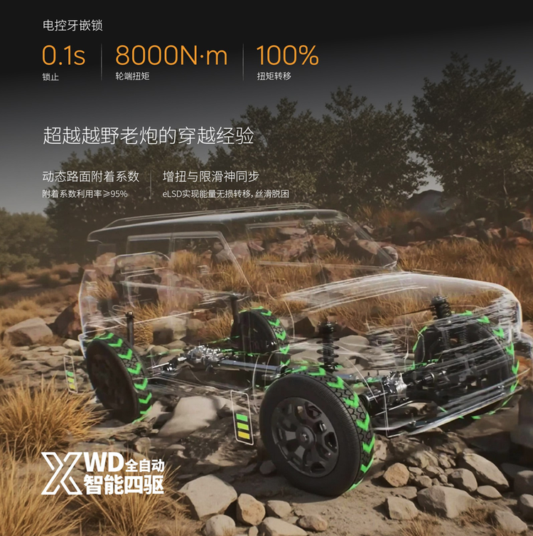 再来说说这套XWD全自动智能四驱,也是捷途的核心王牌,有四个亮点。第一,响应够快,0.01秒识别路况、0.02秒决策、0.07秒执行,比传统适时四驱快20%,比老司机反应还快,冰雪路面起步、紧急避险时,这个速度能避免很多意外。第二,硬核脱困,配备电控牙嵌差速锁,0.1秒就能锁止车轮,瞬间实现100%扭矩转移,轮端扭矩高达8000N·m,交叉轴、泥坑这些复杂路况,不用手动操作,系统自动分配动力,新手也能轻松脱困。