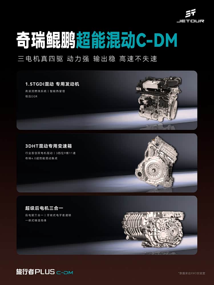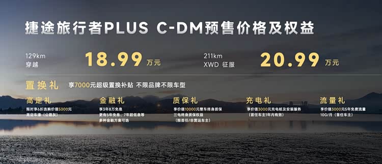 混动版捷途旅行者PLUS C-DM同样两款车型:129km穿越(18.99万)和211km XWD征服(20.99万),核心差异在续航和四驱配置。动力上搭载奇瑞鲲鹏超能混动C-DM技术,实现电+油智能切换,城市路况以电为主,通勤一周0油耗;高速以油为主,极致节能;越野时以混动模式输出,动力澎湃且油耗仅为同级油车的一半。该车搭载43.24kWh宁德时代三防电池,129km版本纯电续航满足日常通勤,211km版本综合续航可达1300km,同时配备同级第一的2.2kW+6.6kW内外放电功能,露营、户外用电需求轻松满足,首任车主还能免费获得充电桩及安装服务。