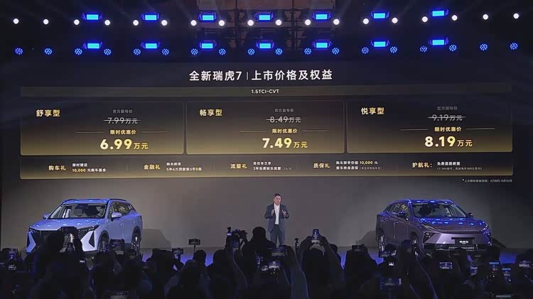 瑞虎7共推出舒享型、畅享型、悦享型三款车型,指导价7.99万-9.19万元,限时价6.99万-8.19万元。