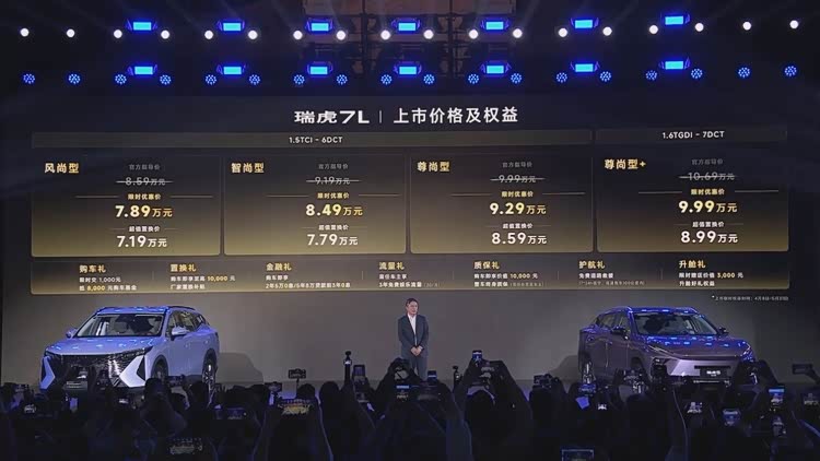 瑞虎7L共推出风尚型、智尚型、尊尚型、尊尚型+四款车型,指导价8.59万-10.69万元,限时价7.89万-9.99万元,置换价7.19万-8.99万元。