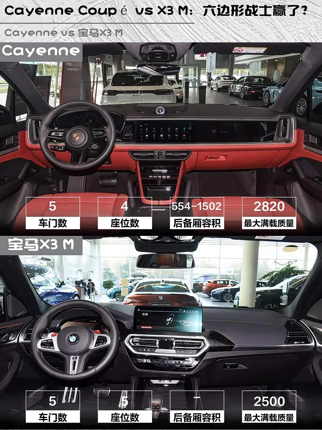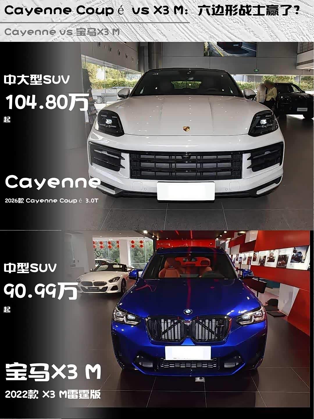 车家号·0浏览·2026-04-10 08:23 · 北京保时捷Cayenne Coupé 3.0T vs 宝马X3 M(参数|询价)雷霆版,百万级性能SUV怎么选?🤔