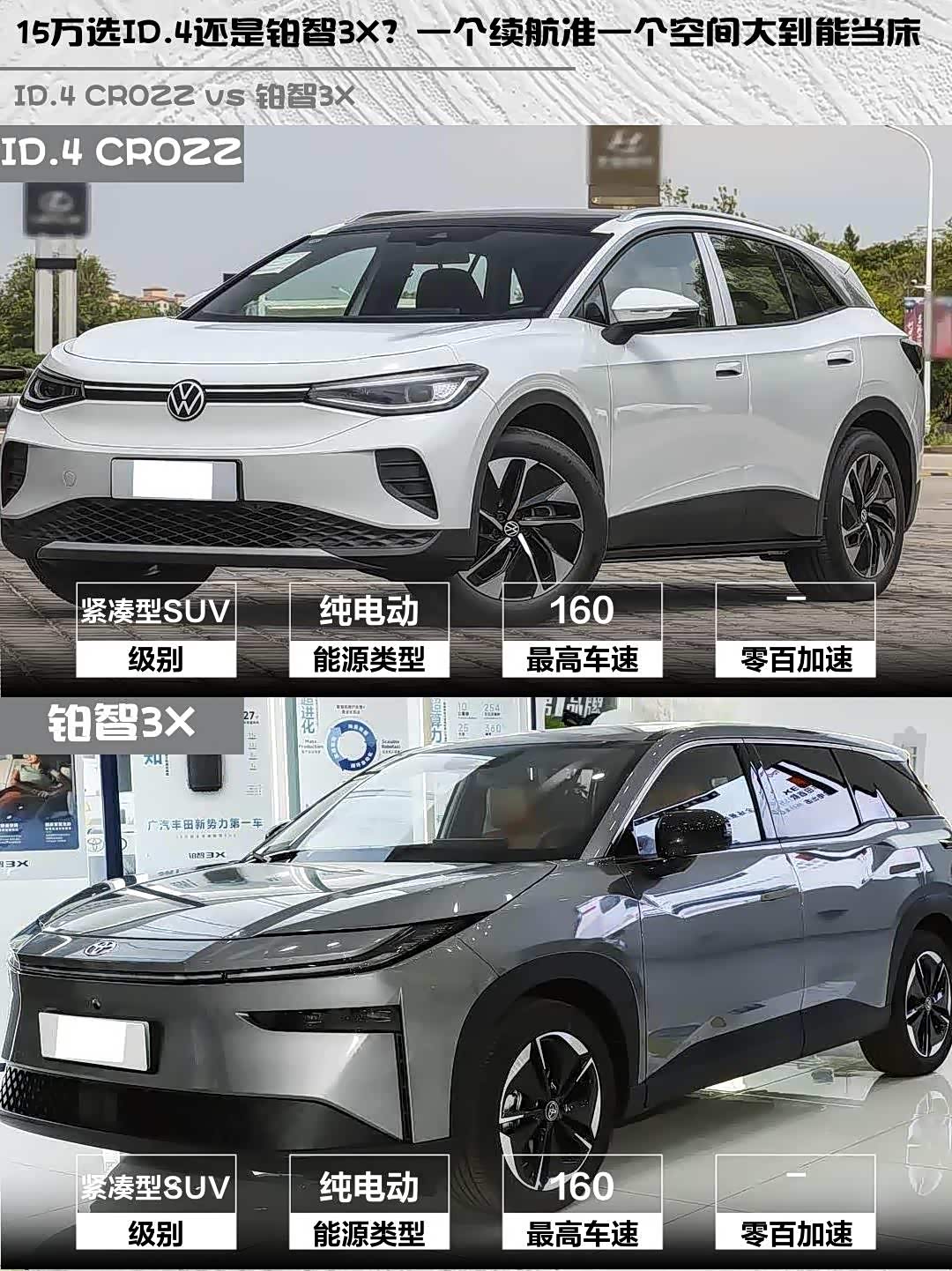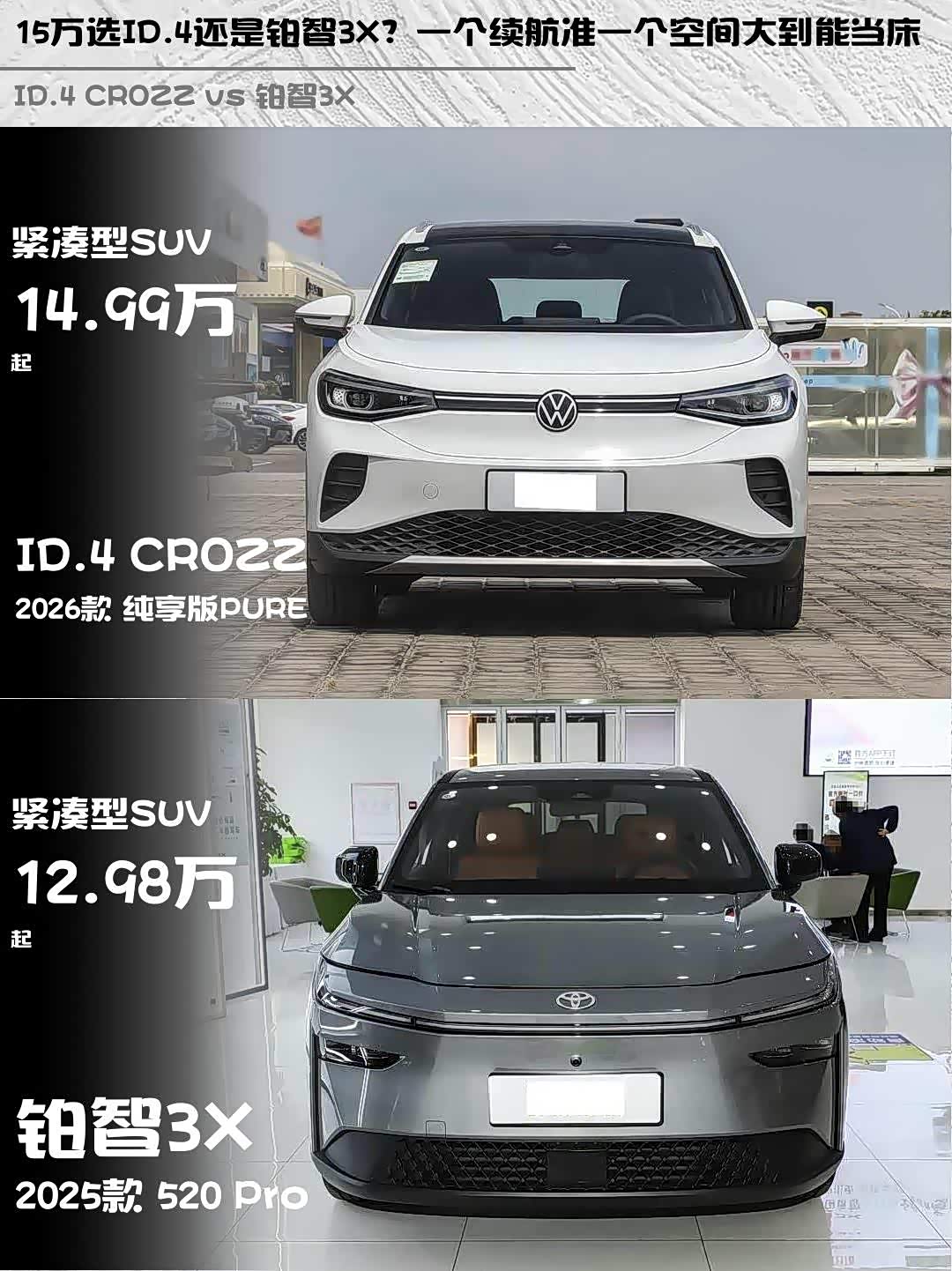 车家号·0浏览·2026-04-10 08:32 · 北京最近在选15万级纯电SUV的朋友看过来!今天深度对比两款热门选手—— ID.4 CROZZ(参数|询价) 2026款纯享版PURE和铂智3X 2025款520 Pro,实测干货直接上菜!🍗