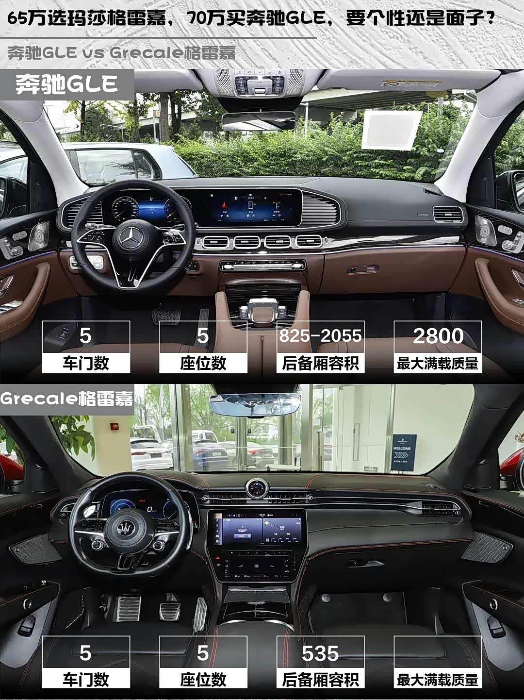 奔驰GLE不愧是豪华标杆!双联屏+木纹饰板+64色氛围灯,夜店风氛围拉满,座椅包裹性一流,空气悬挂滤震超柔软,过坑洼像坐船。Grecale内饰进步很大,全液晶仪表+触控屏科技感强,但车机卡顿像用老款安卓机…运动座椅偏硬,长途可能会累。