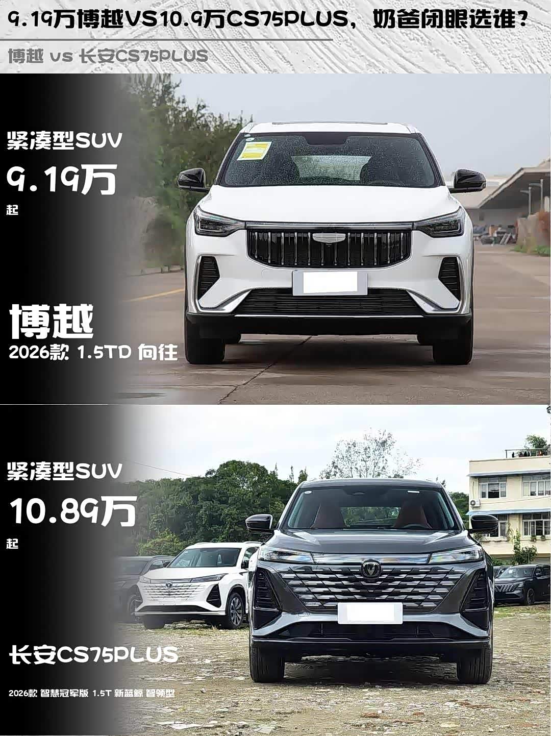 最近在选10万级家用SUV的朋友看过来!👀 深度对比两款热门选手——吉利博越2026款1.5TD向往和 长安CS75PLUS(参数|询价) 2026款智慧冠军版1.5T新蓝鲸智领型,实测干货分享来啦!💪