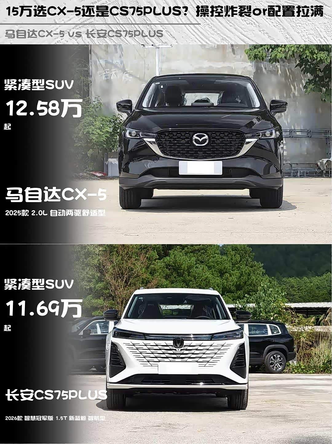 最近后台被问爆的对比来了!今天拉出两款15万级热门选手——马自达CX-5 2025款 2.0L舒适型和长安CS75PLUS 2026款智慧冠军版,实测干货奉上!