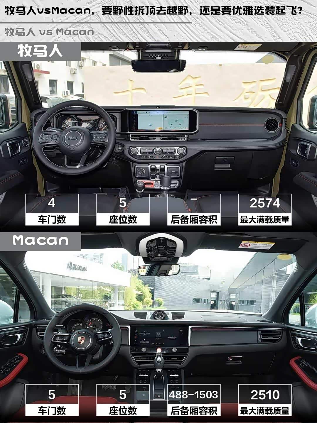 实用性:Macan后备厢更大,牧马人后排能放平当床车
