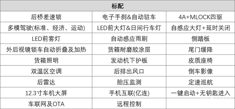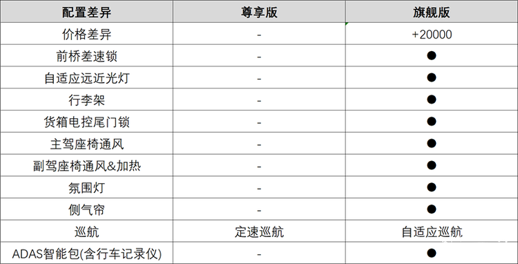 旗舰版是顶配车型,相比尊享版购车成本增加2万元,配置方面升级更偏向豪华感。例如自适应远近光灯、行李架、货箱电控尾门锁、主驾座椅通风、副驾座椅通风&加热、氛围灯、侧气帘、ADAS智能包(含行车记录仪)等等,定速巡航也升级为自适应巡航。除此以外,还增加了前桥差速锁,适合极限路况脱困。这些配置升级适合对整车档次感由要求的用户,以及一些深度极限玩家。