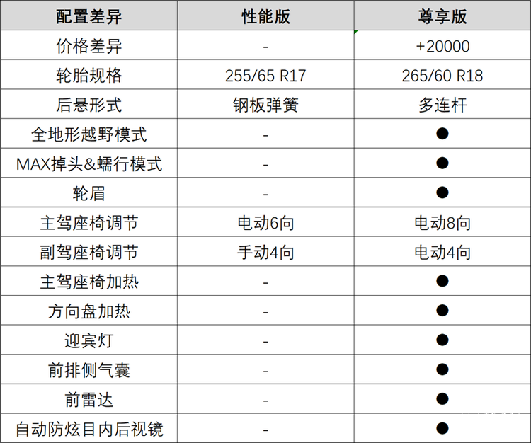 尊享版是中配车型,相比性能版购车成本增加2万元,配置方面增加了轮眉、主驾座椅加热、方向盘加热、迎宾灯、前排侧气囊、前雷达、自动防炫目内后视镜等等,并且将性能版上部分配置升级,轮胎采用265/60 R18尺寸,后悬架行驶升级为多连杆结构,主驾座椅调节由电动6向升级为电动8向,副驾座椅调节由手动4向升级成电动4向。并且增加了全地形越野模式和MAX掉头&蠕行模式。
