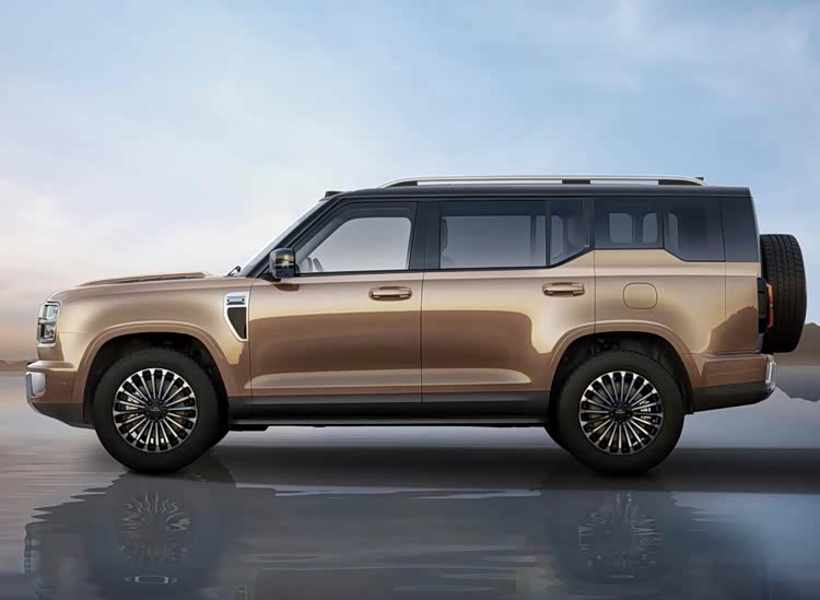 车身侧面线条规整挺拔,平直的车顶搭配银色行李架,既保障车内头部空间,又提升户外装载灵活性,宽体轮眉搭配大尺寸越野轮毂,进一步凸显硬派气场,传统外露式车门把手延续硬派SUV经典设计,深受越野爱好者青睐。车身提供两种长度版本,长宽高分别为5138(5299)/2050/1970mm,轴距达3000mm,超长轴距为车内空间布局提供充足基础,同时可选装双色车身、电动侧踏、不同样式轮圈等,满足用户个性化需求。车尾采用侧向开启尾门,搭配外挂式全尺寸备胎,既彰显越野属性,又能拓展后备厢储物空间,竖向布局的LED尾灯与前脸灯组形成呼应,视觉效果出众。