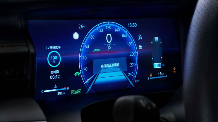 变速系统采用e-CVT,驱动形式为前轮驱动。整套系统的特点不是爆发力,而是顺畅和效率,在市区走走停停时基本可以大量使用电动模式,这也是为什么油耗可以压到大约4.2–4.5L/100km。油箱容量约49L,在这种油耗表现下,理论续航轻松接近甚至突破1000km,这也是这台车这次最大的卖点之一。