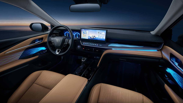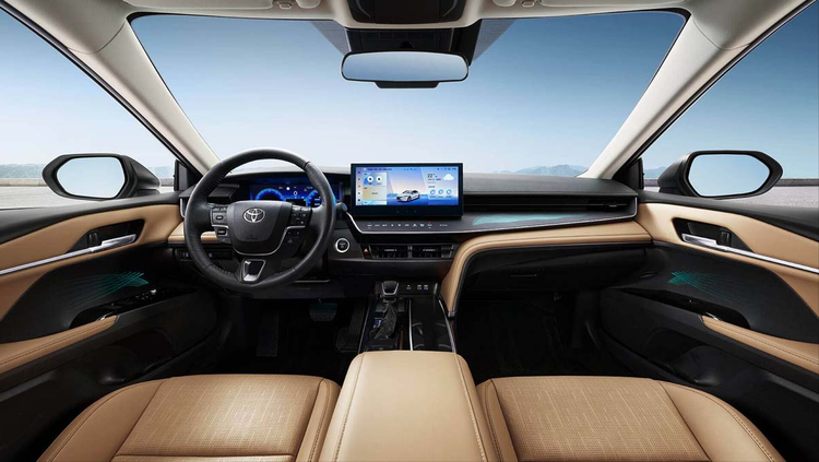 再来看内饰,这次的变化其实蛮大。整体设计从“传统商务风”转向偏科技路线,中控采用悬浮式大尺寸屏幕,加上全液晶仪表,视觉上更接近现在丰田新世代设计语言。国内版本还做了不少本地化,例如语音控制、导航整合这些功能都会更贴近国内使用习惯。