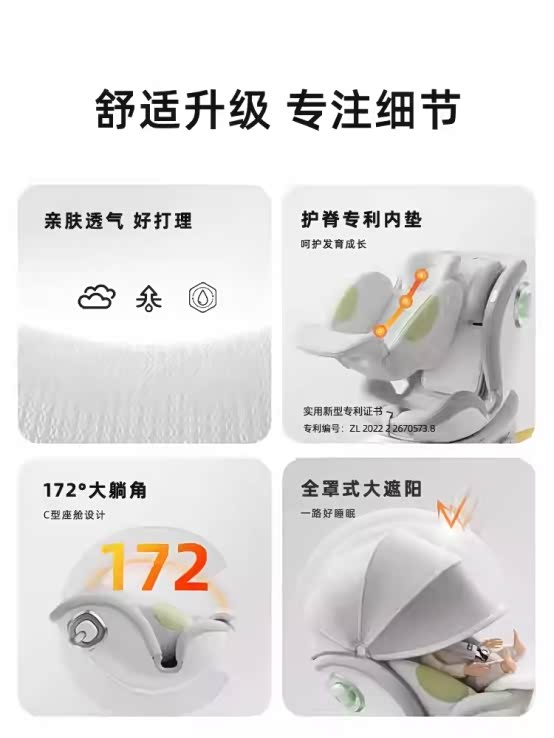 3. 172°超大躺角,0重力体验这个躺角比很多同级别座椅都大,宝宝就像躺在悬浮舱里,特别适合新生儿和汽车后座上翘幅度大的车型。
