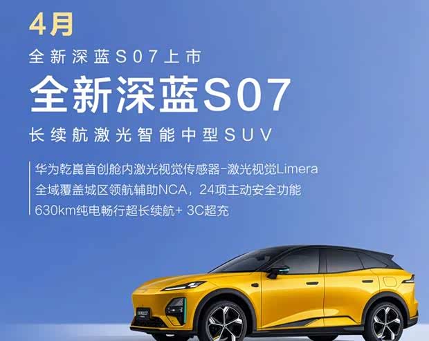 车家号·0浏览·2026-04-10 10:31 · 北京深蓝汽车近日发布了旗下中型SUV—— 深蓝S07(参数|询价)华为乾崑激光版车型的官方图片。该车型在智能驾驶辅助系统方面进行了重要升级,从原有的华为乾崑ADS 4 SE系统提升至华为乾崑ADS 4 Pro版本,官方表示这一升级将带来更精准的环境感知与更可靠的智能驾驶体验。据了解,当前在售的深蓝S07共有7款车型,价格范围在15.69万元至17.49万元之间。最新消息显示,这款新增版本计划于本月内正式推向市场。
