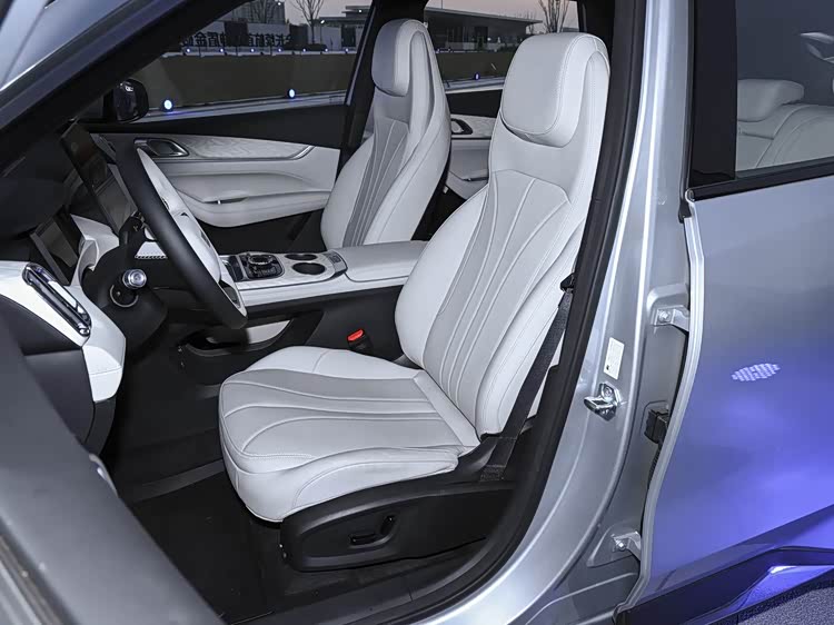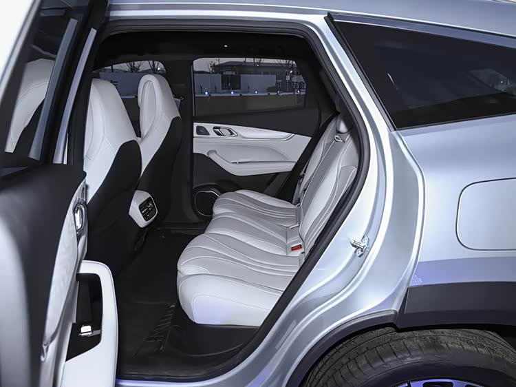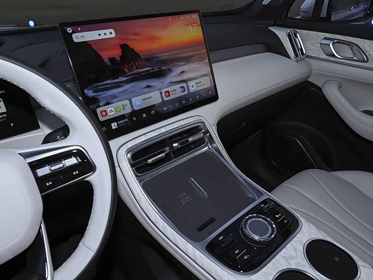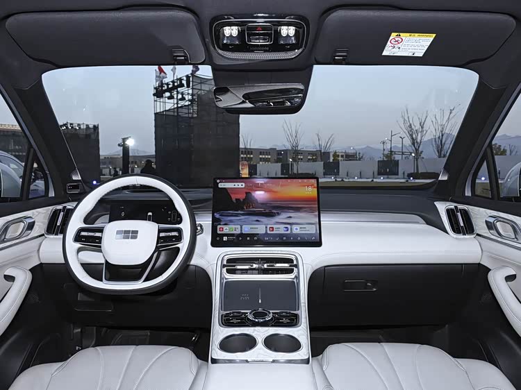 车尾部分,贯穿式尾灯,依旧是向下弯折的设计,相比银河L7略有简化,点亮之后效果不太相同。车尾细节略有调整,显得更加流行一些,内饰部分采用了最新的家族风格,但也并没有相比银河L7增配,而是少了一块副驾驶座娱乐屏,悬浮式驾驶液晶屏微微偏右,配合液晶仪表盘和Hud组成联动系统,平直的中控台面加入了层次感丰富的装饰,还有水晶式的旋钮和镀铬装饰进行补充,提升了豪华感。
