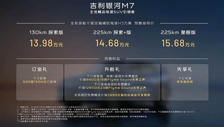 近日,吉利 银河M7(参数|询价)车型正式开启预售,该车给出的预售价格13.98万元,令人震惊,虽然吉利向来有拉高价格拉高预期,最后给一个低售价的传统,不过高这么多也确实是出人意料,大家都知道该车就是银河L7的装修版本,目前后者的指导价格11.58万元起,加上各种优惠补贴,实际的售价也就10万元左右,那这高了4万元,确实是离谱,这种偏离度过高的营销,不见得对于产品有利,只能说不知道吉利又在玩什么花样。