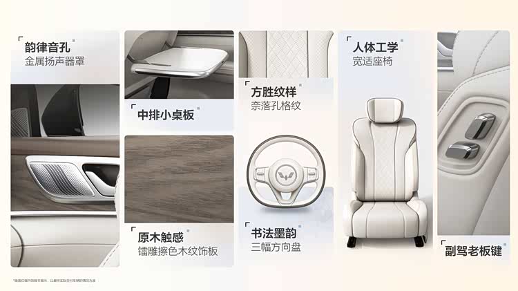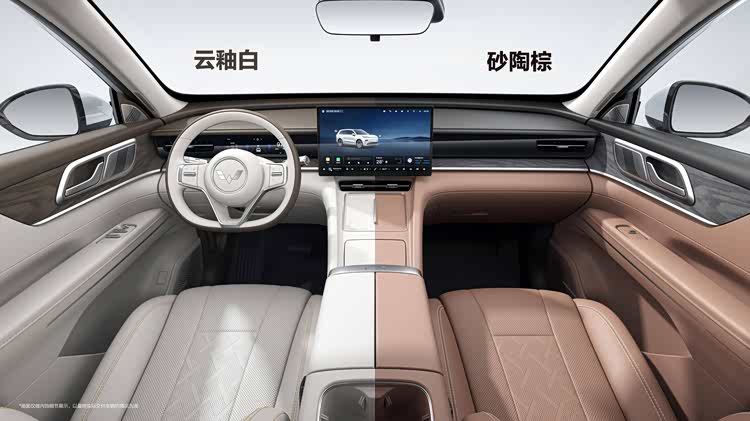 内饰方面延续了中式典雅格调,对称式布局营造出规整大气的座舱氛围。且采用了大量软质材料包覆,提供云釉白、砂陶棕两款配色,兼顾美观与实用。