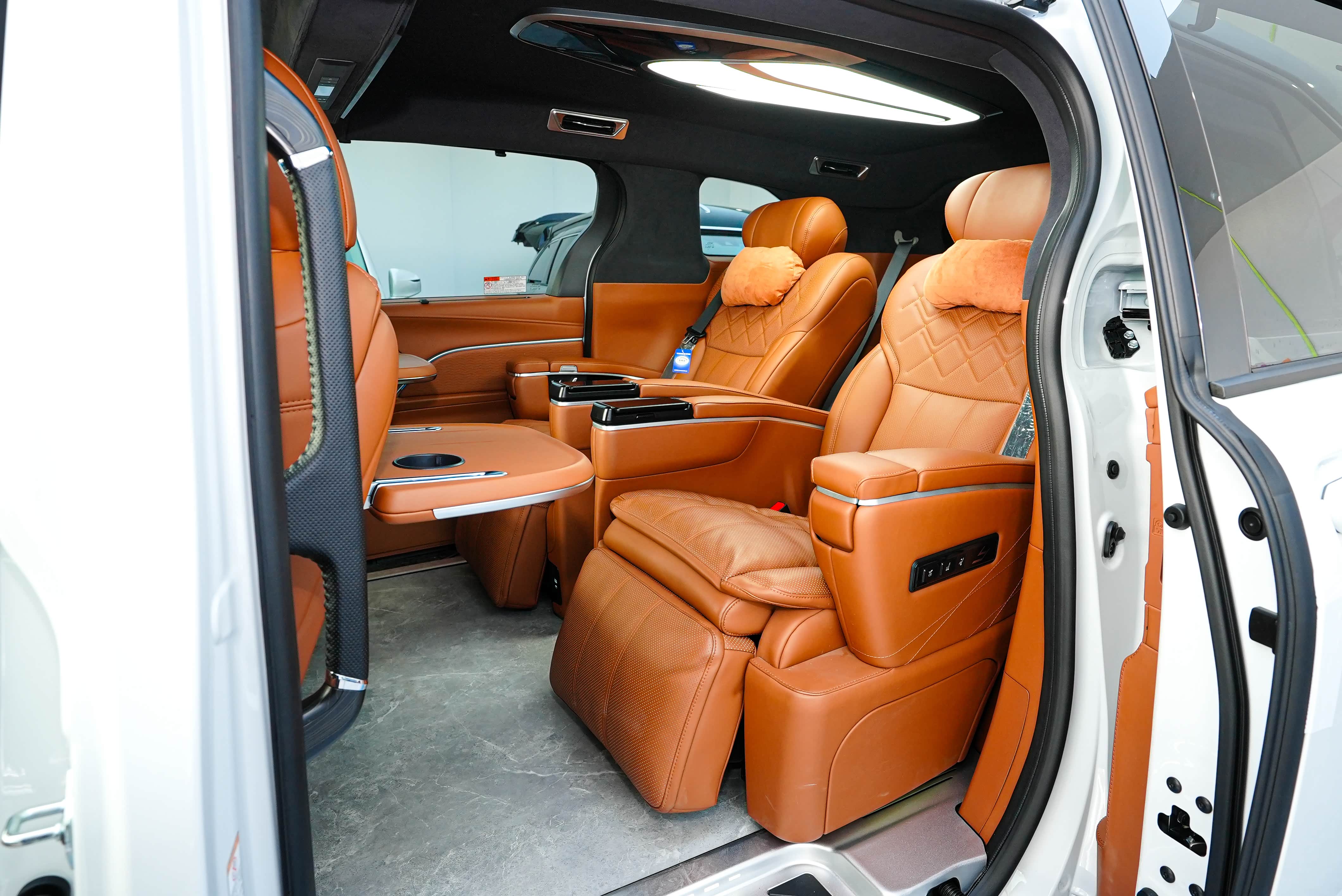 内饰是赛那改装的灵魂,也是太原车主最关注的部分,更是山西太原商务车改装的核心竞争力所在,核心升级项目如下: 航空座椅升级:中排是MPV的核心,原厂赛那中排座椅功能单一,升级航空座椅是必选项。座椅采用纳帕真皮包覆,支持电动调节、通风、加热、气动按摩、腿托、旋转等功能,完美贴合人体工学,长途乘坐零疲惫,商务接待客户、家庭出行带老人小孩,舒适度直接拉满,这是赛那改装中提升体验感的关键一步,也是山西太原商务车改装的标志性项目。 内饰全舱包覆:针对赛那原厂塑料感强的问题,对中控台、门板、扶手箱、车顶等区域进行全真皮包覆,搭配精致缝线工艺,彻底告别廉价感,触摸之处皆是细腻质感,同时可以根据车主喜好定制配色,比如家用选温馨暖色调,商务选沉稳深色调,个性化拉满,这体现了山西太原商务车改装的精细化工艺。 地板与氛围灯升级:铺设航空铝地板,不仅颜值高,还耐磨易清洁,彻底解决原车地毯难打理的问题,是赛那改装的“标配项目”,也是山西太原商务车改装中提升内饰档次的基础操作;同时升级全车氛围灯、九宫格顶灯,多色可调,营造温馨豪华的座舱氛围,夜晚出行氛围感拉满。 后排娱乐与实用配置:加装吸顶电视、后排小桌板、无线充电等,兼顾家用娱乐与商务办公,比如小桌板可以放电脑、文件,商务洽谈更方便;吸顶电视让后排孩子长途出行不无聊,家用商务双适配,这是赛那改装中兼顾多功能需求的热门选择。