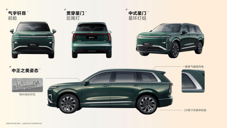 细节之处更见匠心,新车配备20英寸米其林轮胎,搭配流畅的车身线条,气场沉稳却不失质感;前风挡下角专属柳州地标印花、尾部隐藏式后挡风雨刮,每一处设计都兼顾美观与实用。车漆方面,星光L选用国际顶级巴斯夫2K高透清漆,历经8道匠心工艺喷涂,车漆光泽饱满,兼具耐刮耐磨、抗老化的实用属性,同时推出苍松绿、沁湖蓝、墨竹黑、山岩银、晨霜白五款中式车色,覆盖家用、商务等多元审美需求。