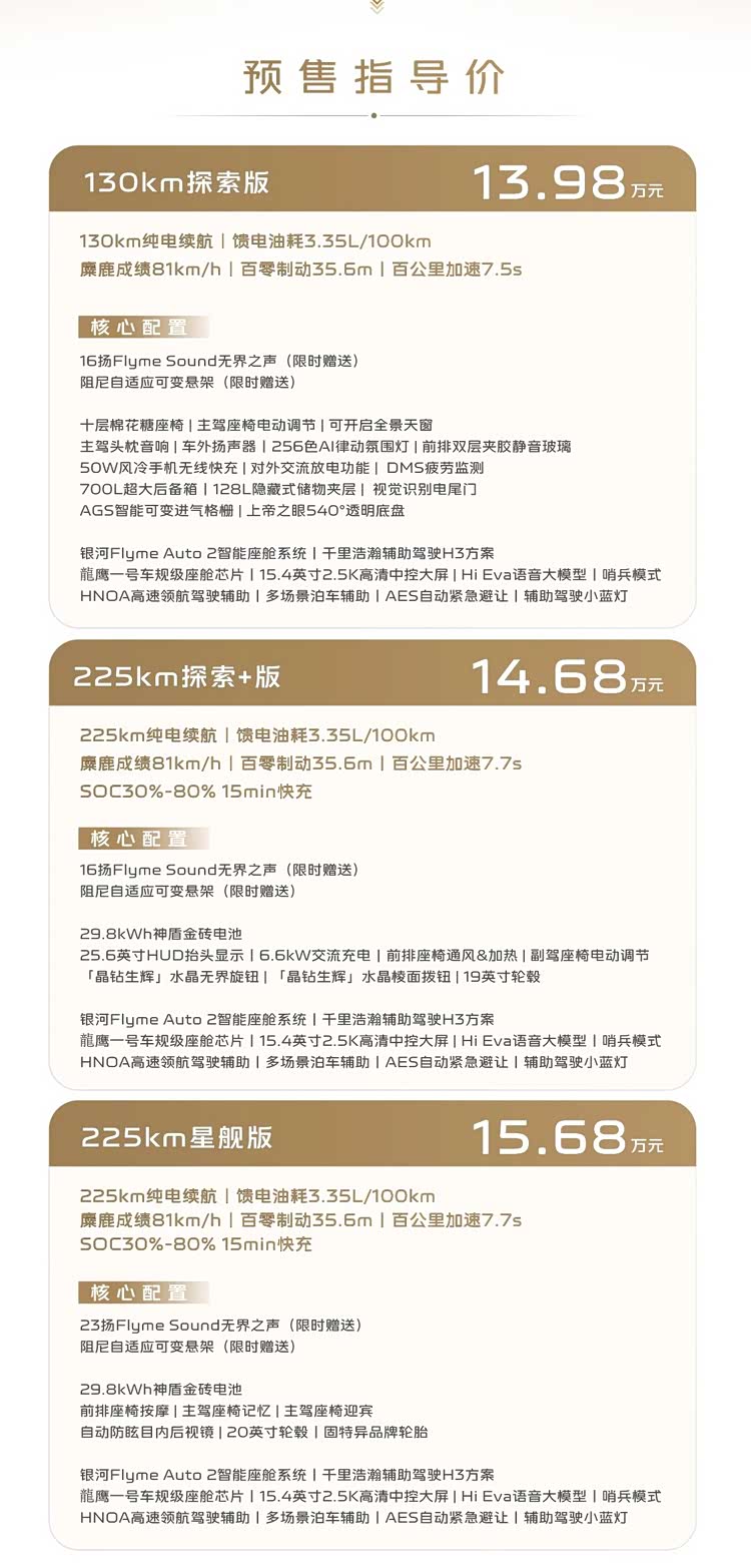 高配车型则还搭载水晶无界旋钮、水晶棱面拨钮、自动防眩目内后视镜、23扬Flyme Sound无界之声(限时赠送)、主驾座椅记忆迎宾、副驾座椅4向电动调节、前排座椅通风/加热/按摩、25.6英寸HUD抬头显示、前排预紧限力安全带等配置,并可选装双色车身套装。