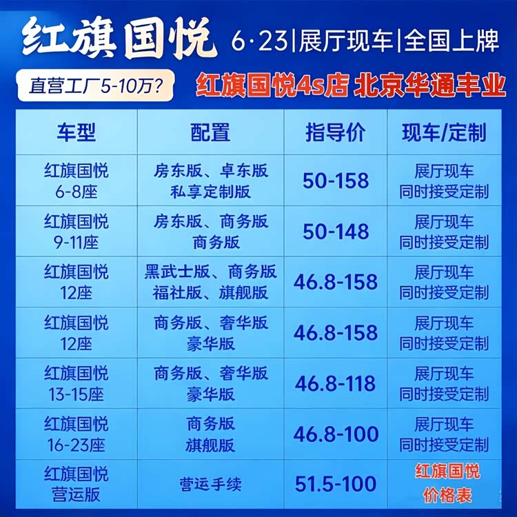 红旗国悦4S店 北京华通丰业 红旗国悦2026款落地价 【红旗国悦总部】6-9座房车版70万到118万,10座到12座豪华版68万到148万,13座到17座接待版45.6万到78万,18座到23座45.6万到64万,外观颜色可选山岩棕,日光金,至臻黑,天际灰,内饰支持个性化定制,红旗国悦总部提供五年十二万公里超长改装质保,全国送车上门,当天开票手续齐全,工厂直营店,购车无忧!