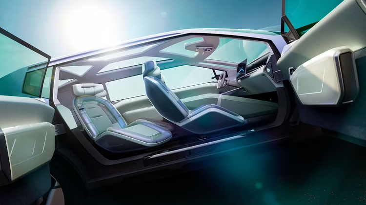 地球车型以地球的生命力与生态平衡为设计核心。偏家用实用派,是一款具有力量感的家用SUV,其外观采用极光之盾配色,一体化车身轮廓搭配锐利的水晶质感线条,集成式车顶行李架与隐藏式双开启车门设计,提升了日常使用便利性。内饰以“微型地球”为概念,配备由柔性气囊模块构成的包裹式座椅,结合模拟树影的氛围灯场景,营造出宁静且通透的空间。