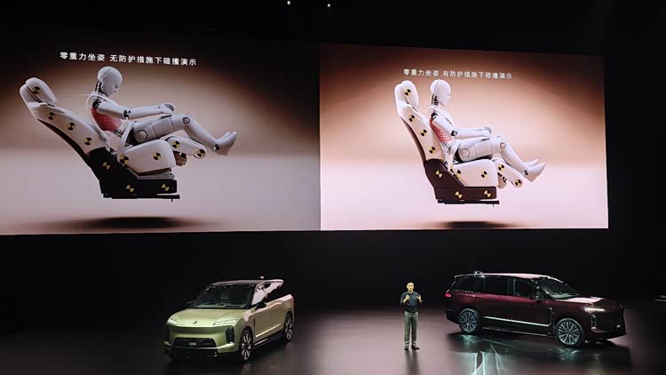就比如,零重力座椅的有保护安全,李斌只是放出了演示动画,让大家来看ES9更安全。却没有展开来讲,如果遇到不可避免的碰撞发生时,车辆的传感器会提前感知方向和速度,点爆相应的气囊。同时,零重力座椅位于两腿之间前端会点爆气囊,实现把人卡住的效果,和安全带一起限制碰撞时身体的前冲。
