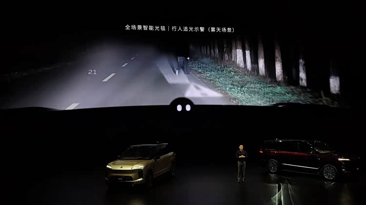 5. 安全部分,AES可以防止夹心追尾,冰雪路面上单侧前后台同时穿刺爆胎后依然可以稳定控制车辆,灯光光毯可以主动标记行人和异物等;