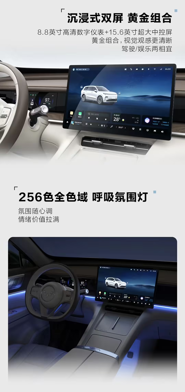新车内饰主打典雅温馨风格,中控搭载8.8英寸数字仪表+15.6英寸中控大屏,配以256色氛围灯、副驾老板键、二排小桌板和书法墨韵三幅方向盘,细节用料注重质感,使用镭雕擦色木纹饰板与亲肤材质座椅。车身尺寸为4980mm×1930mm×1760mm,轴距达2950mm,采用2+2+2独立六座布局,强调每排乘客的舒适性与空间实用性。