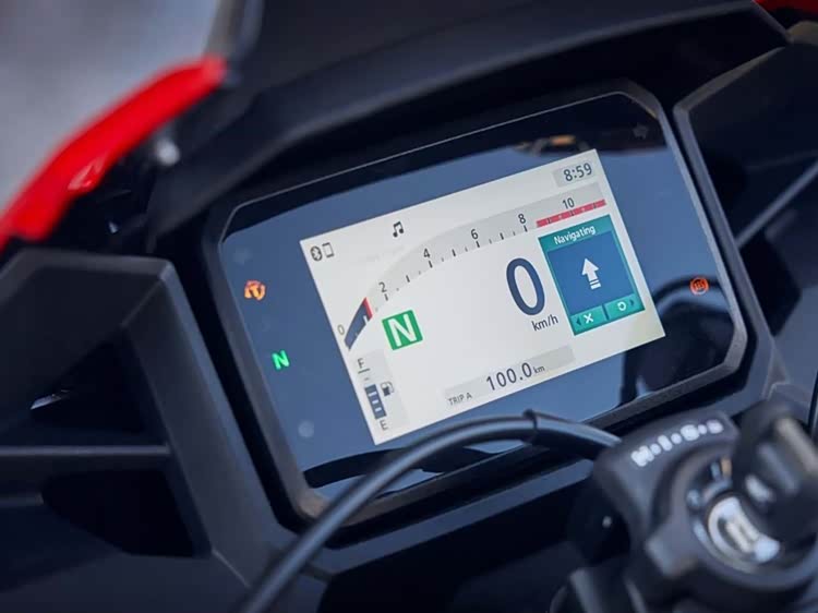 全车灯光采用LED光源,前脸鹰眼式双 LED 大灯为远近光一体化设计,车尾具有家族风格的 LED 尾灯,警示效果醒目,有效提升夜间骑行安全性。车机系统采用5英寸全彩TFT仪表,光学贴合工艺处理,强光下的可视性出色,支持Honda RoadSync手机互联,UI界面偏简洁实用风格,信息读取清晰。功能在当下看来,相当基础。