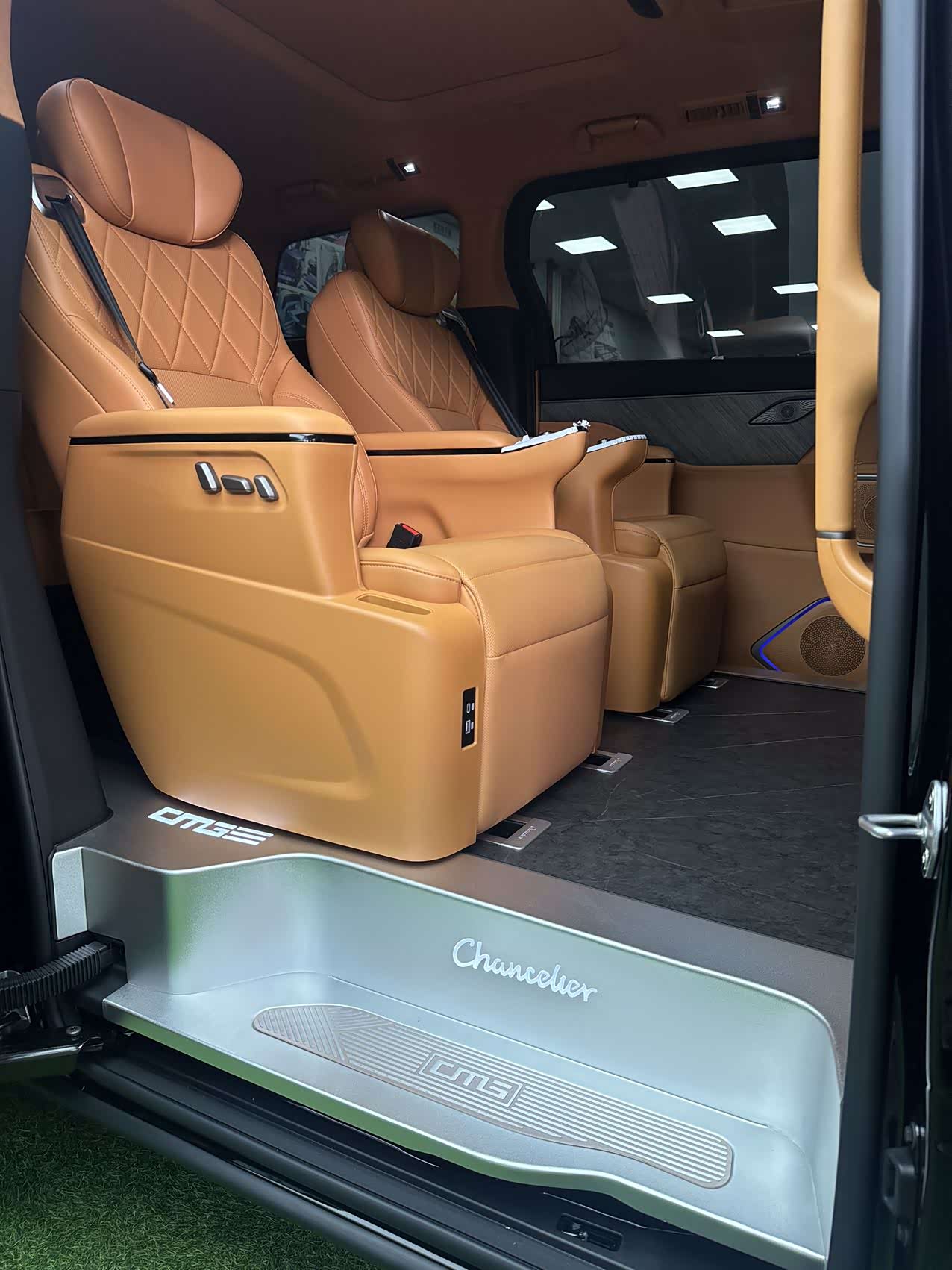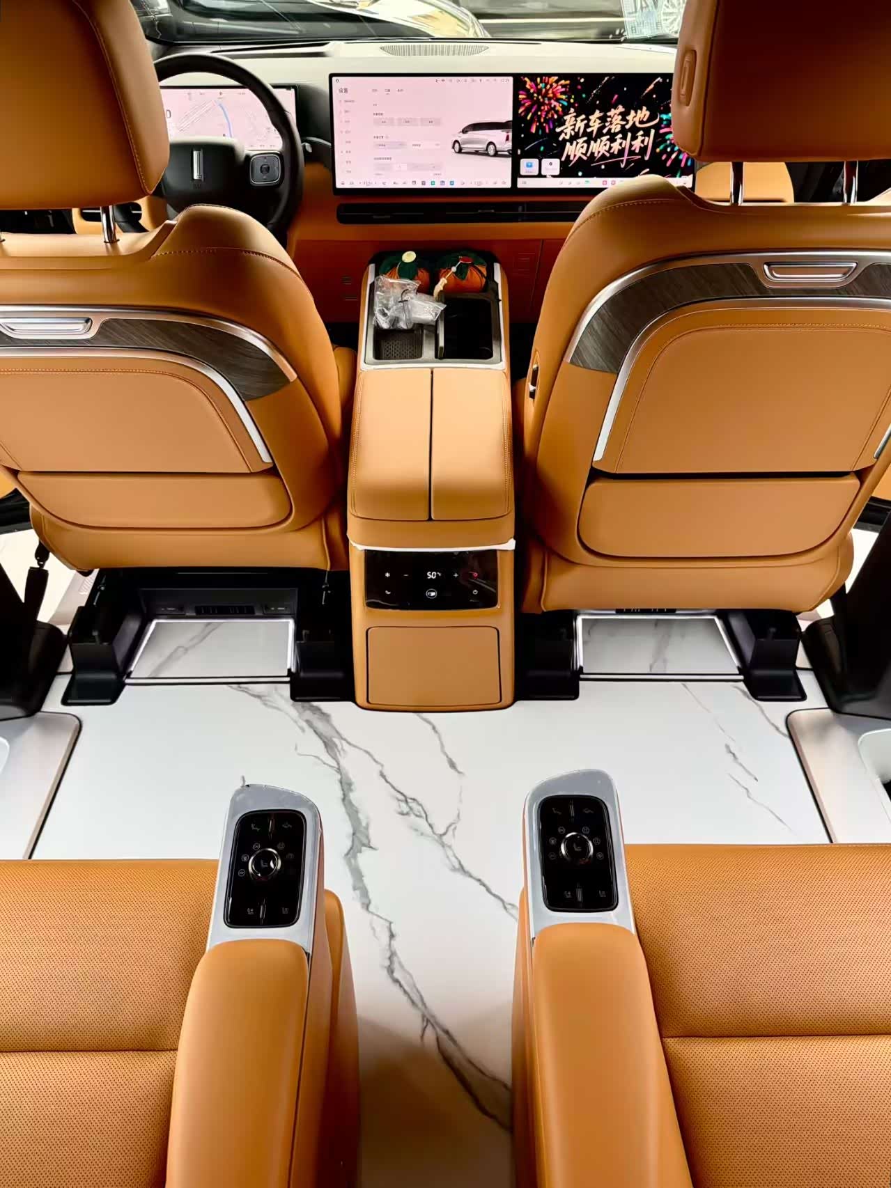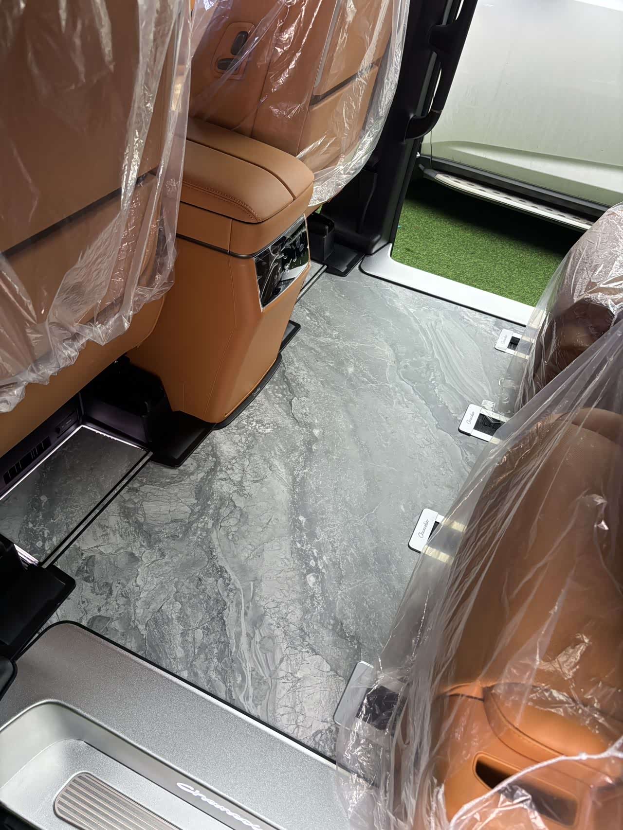 原本杂乱的轨道被完全隐藏,地面平整通透,空间感瞬间提升,高山改装让车内视野更开阔。高级大理石纹理与暖棕内饰相得益彰,档次感直接拉满,硬派MPV秒变豪华移动会客厅,完美契合高山改装的豪华定位。彻底告别原车地毯的脏乱差,日常打理超省心,海口多雨天气也能保持车内干净整洁,解决了高山改装车主的核心痛点。无论是商务接待客户,还是全家自驾环岛,都能给乘客带来极致舒适的乘坐体验,这正是高山改装的核心价值所在。